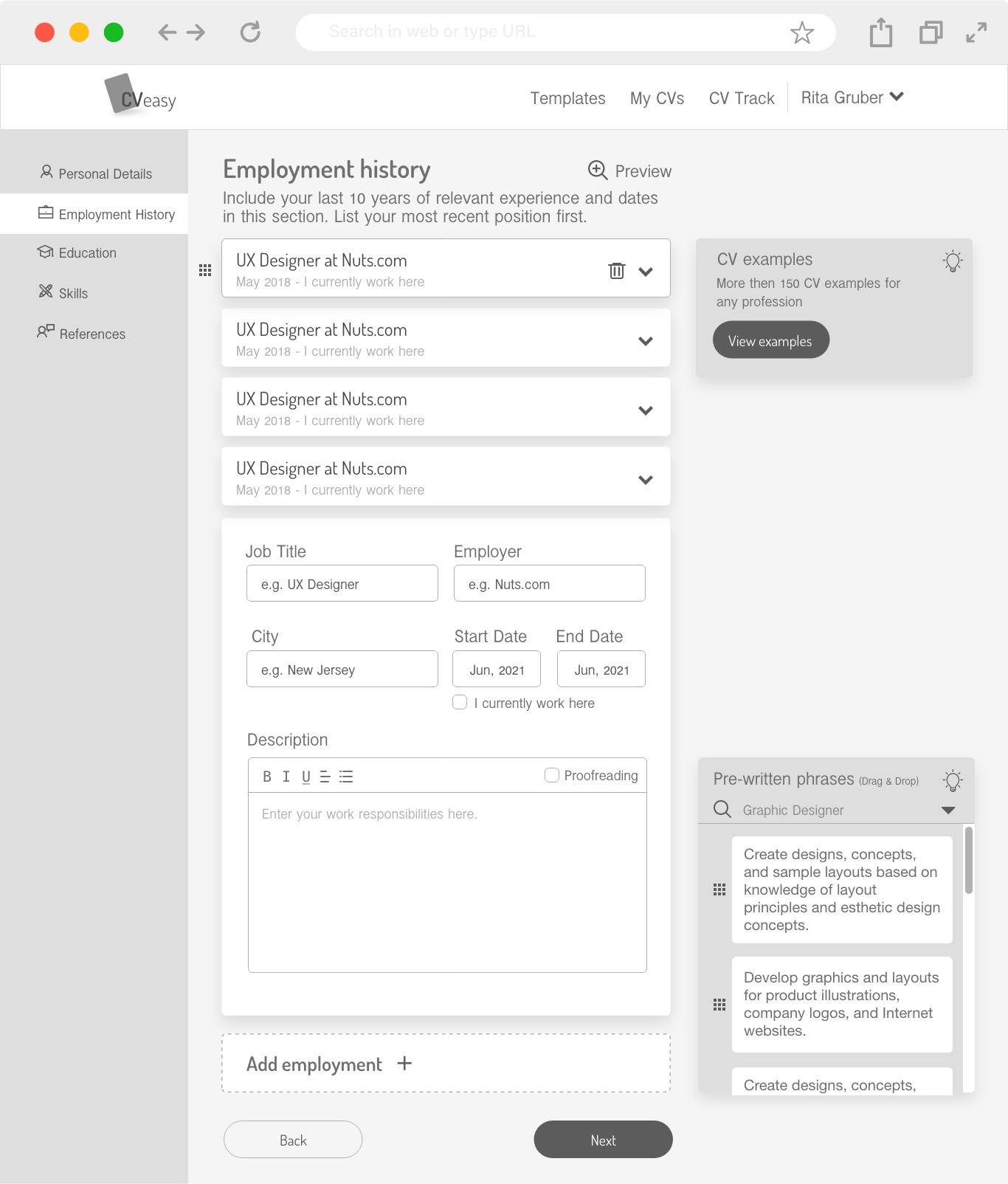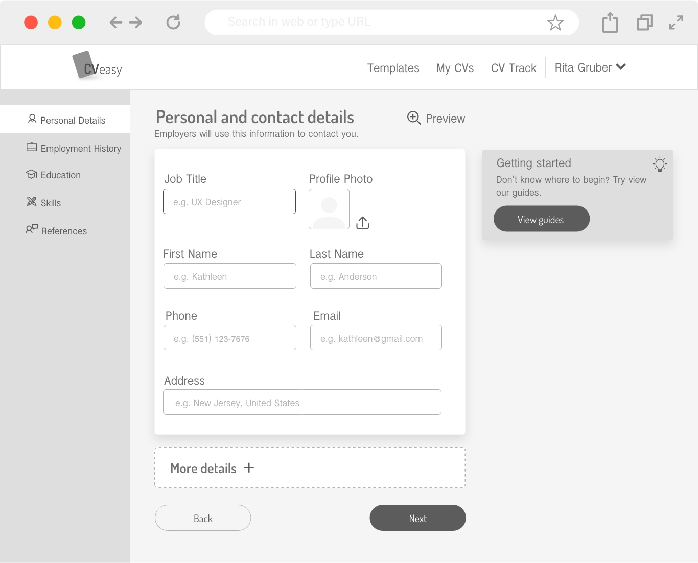 The research led me to the conclusion that a good product should help users overcome their writing anxiety and guide them step by step through their CV writing process